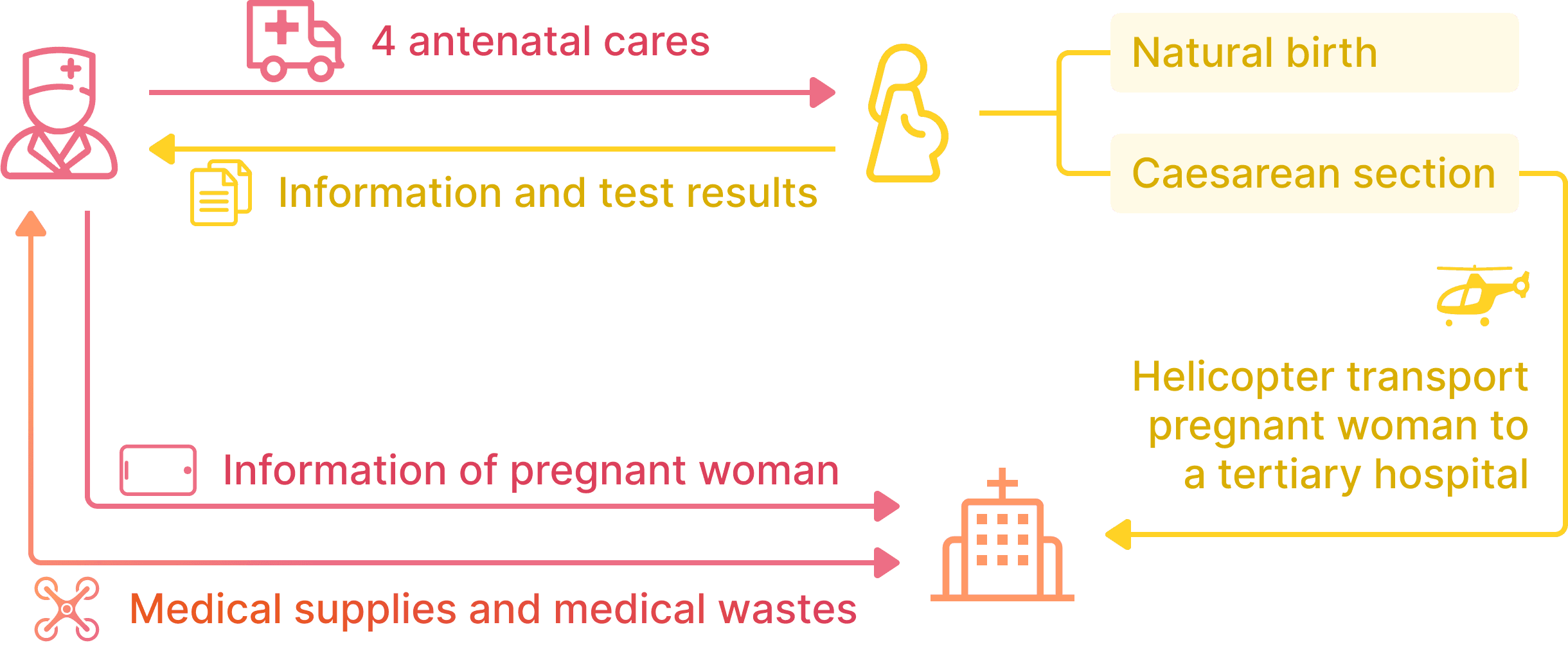 Pregnant women in rural Nepal face a high mortality risk. Professor Roger Smith’s Innovative Helicopter Retrieval Project addresses this by airlifting women with complications during delivery in remote areas to tertiary hospitals, backed by $92 million in funding. While the project has saved many lives, it requires significant resources and focuses only on delivery. As a designer, I believe maternity care should provide long-term support throughout pregnancy.