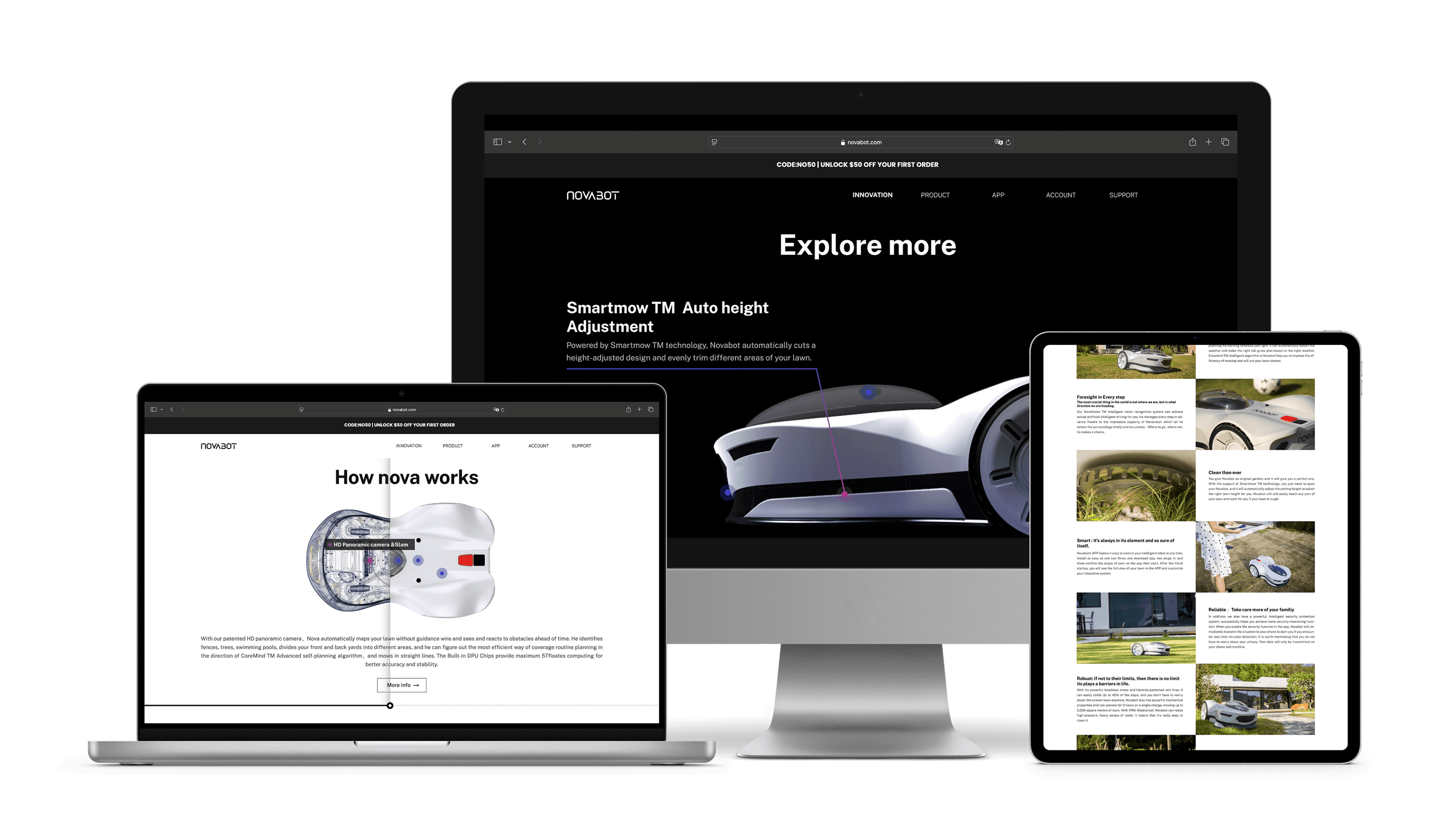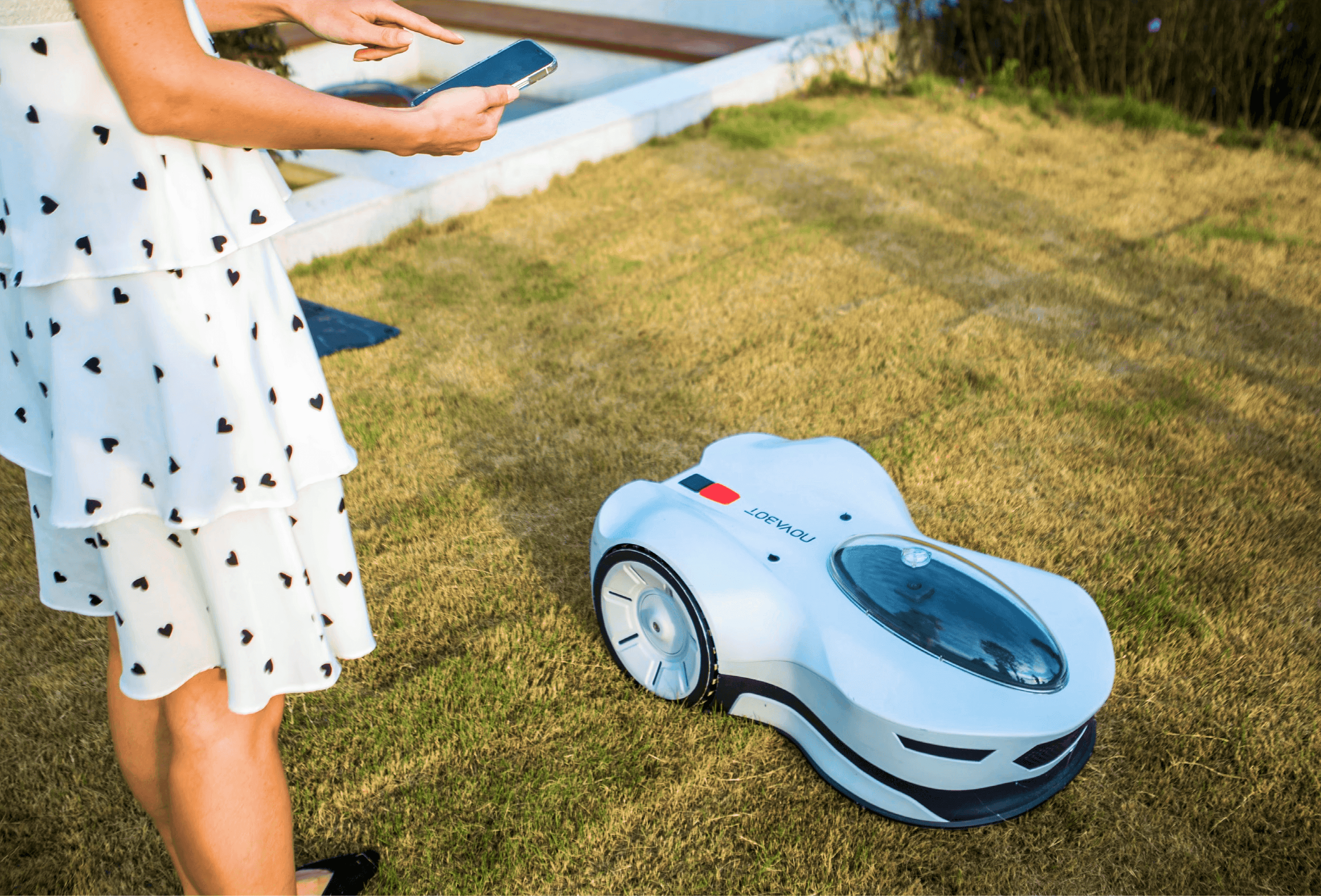 NOVABOT is an autonomous lawn-mowing robot developed for the U.S. market by LF Intelligence, a startup affiliated with the University of Pennsylvania GRASP Lab. It integrates self-charging, autonomous navigation, and automated route planning. The project aimed to bring this hardware product to market through a cohesive visual system, including product appearance, visual identity, and web design.